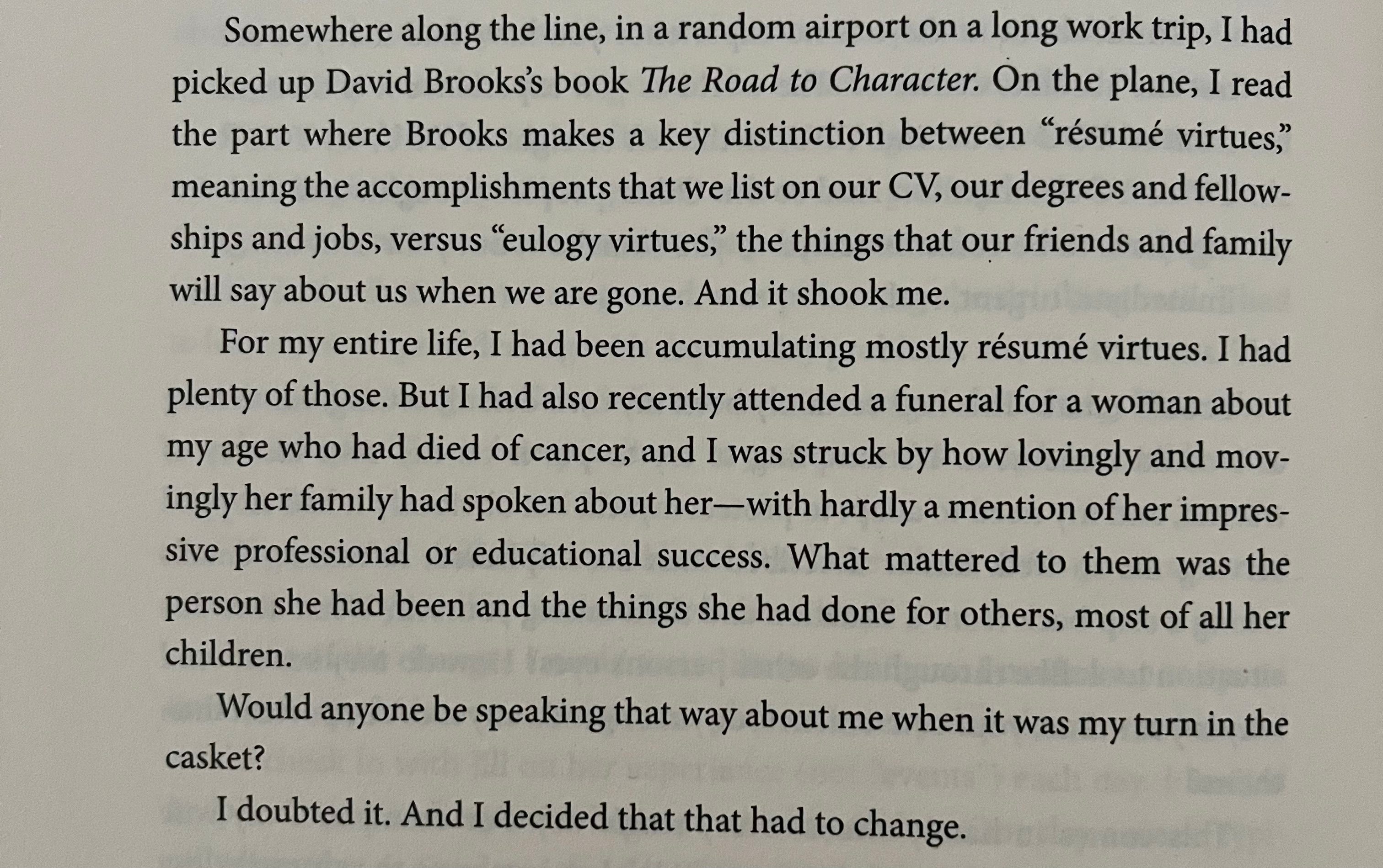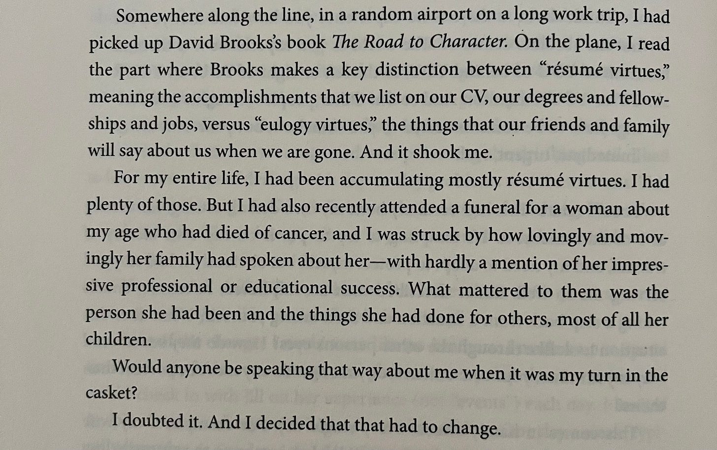 I’ve been considering another kind of bucket list (esp as I barrel into a new decade of my life next week!) which is the “eulogy virtues.” peter attia explains in outlive: