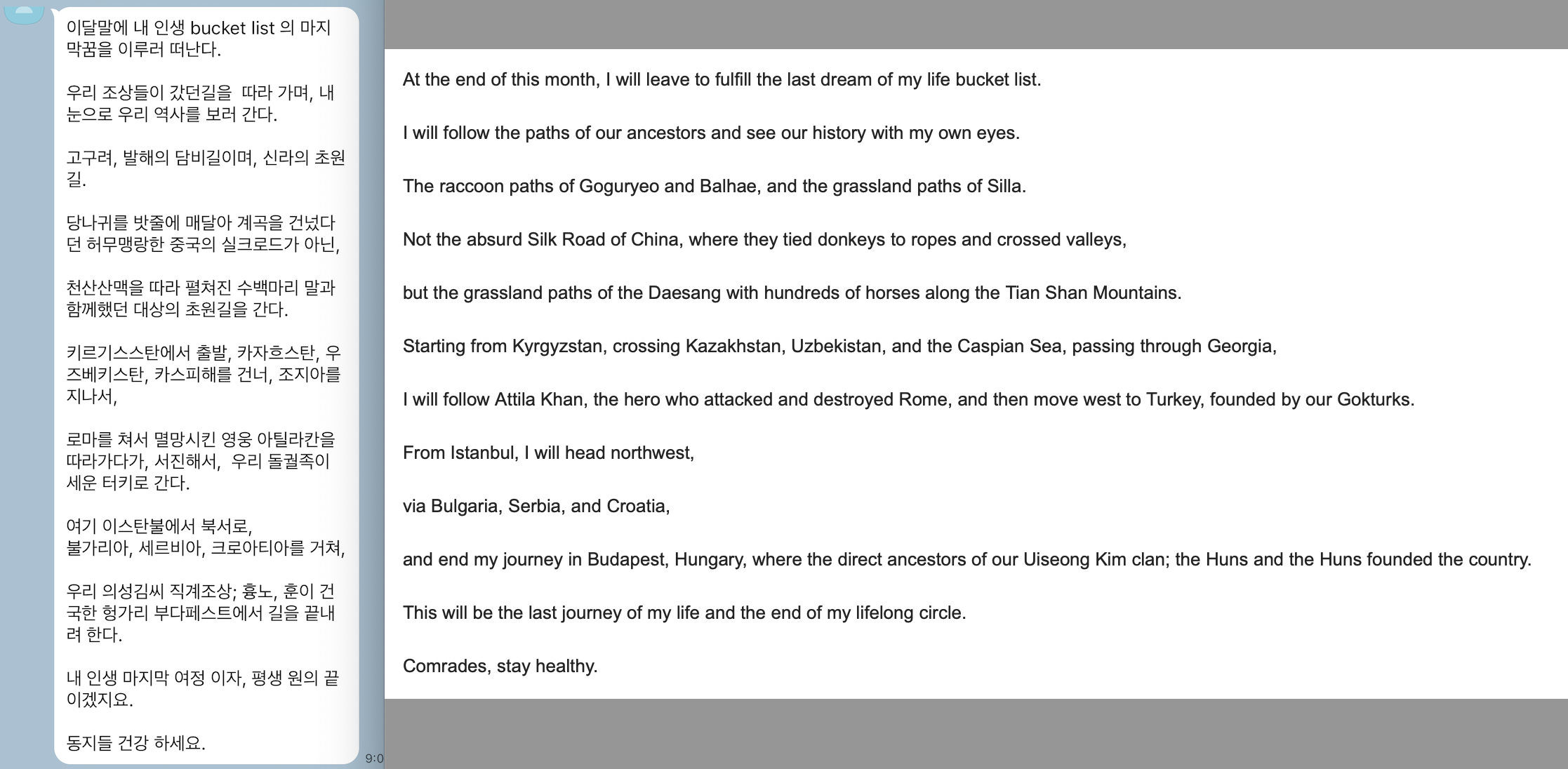 anyway, I’ll leave you with this: my dad, a worldwide traveler and explorer, is on an epic adventure at this very moment. he’s crossing off an item from his bucket list! I can’t read that much korean at once so I ran his text through a translation app (and, therefore, I cannot verify if anything’s accurately translated) but the accidental poetry of it is one I found beautiful (pls don’t cancel my dad for the khan thing).